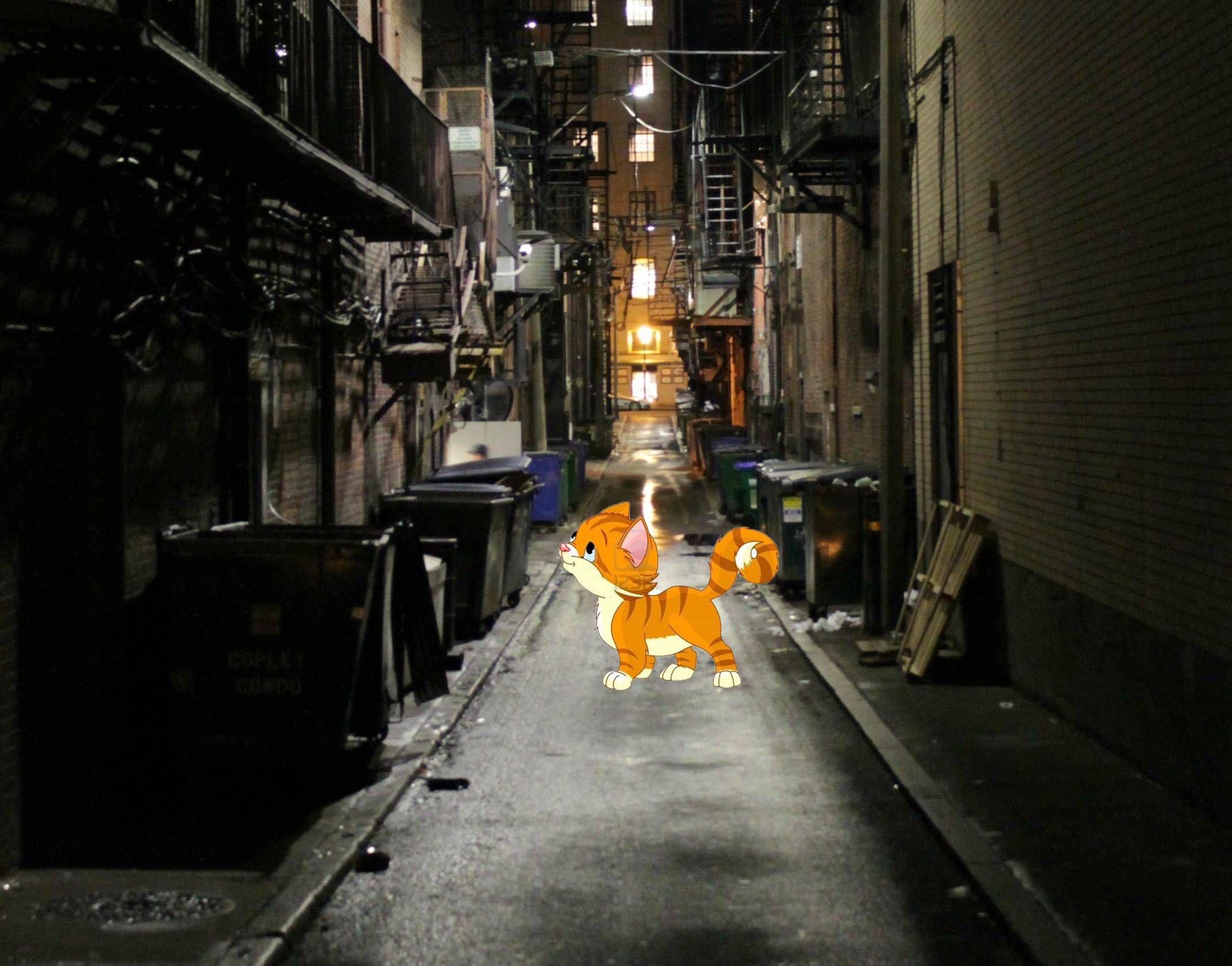 "Confrontation in the Dark Alley" Whiskers encounters humans while walking the dark alley! Whiskers decides to face the oncoming figures in the dark alley.